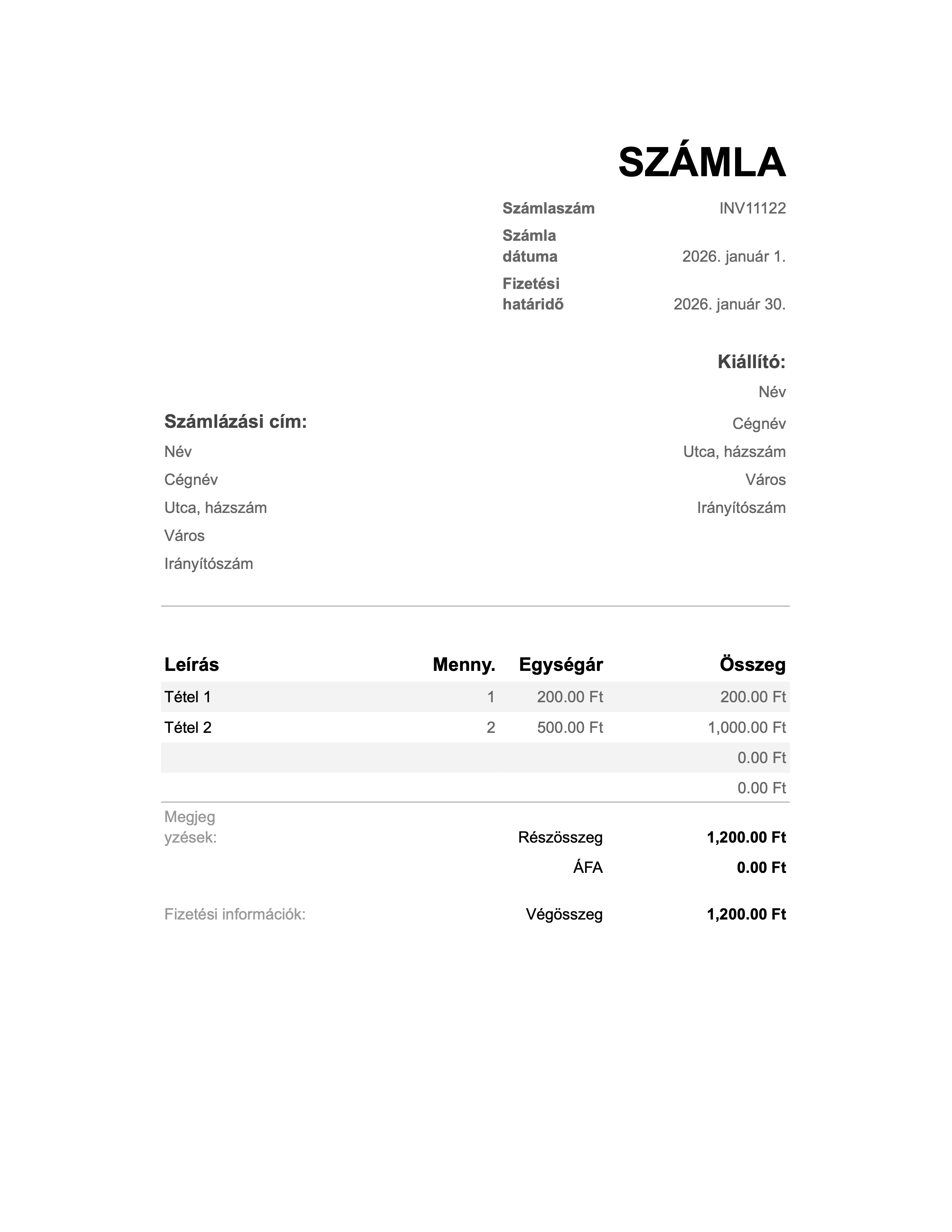 Ez a magyar számlaminta letisztult és professzionális megjelenést biztosít vállalkozók és kisvállalkozások számára.
