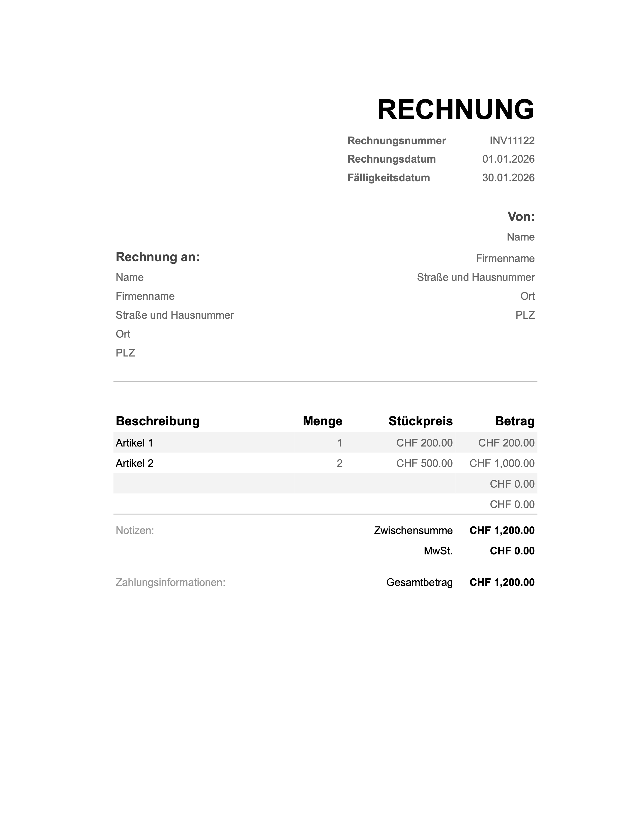Diese Rechnungsvorlage für Liechtenstein bietet ein klares und professionelles Layout für Selbständige, Dienstleister und kleine Unternehmen.