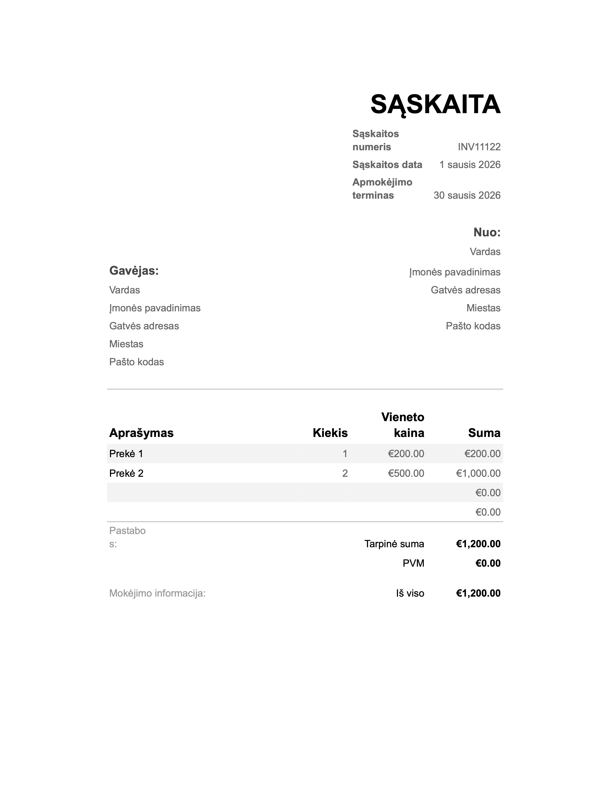Šis Lietuvos sąskaitos faktūros šablonas turi aiškų ir profesionalų dizainą.