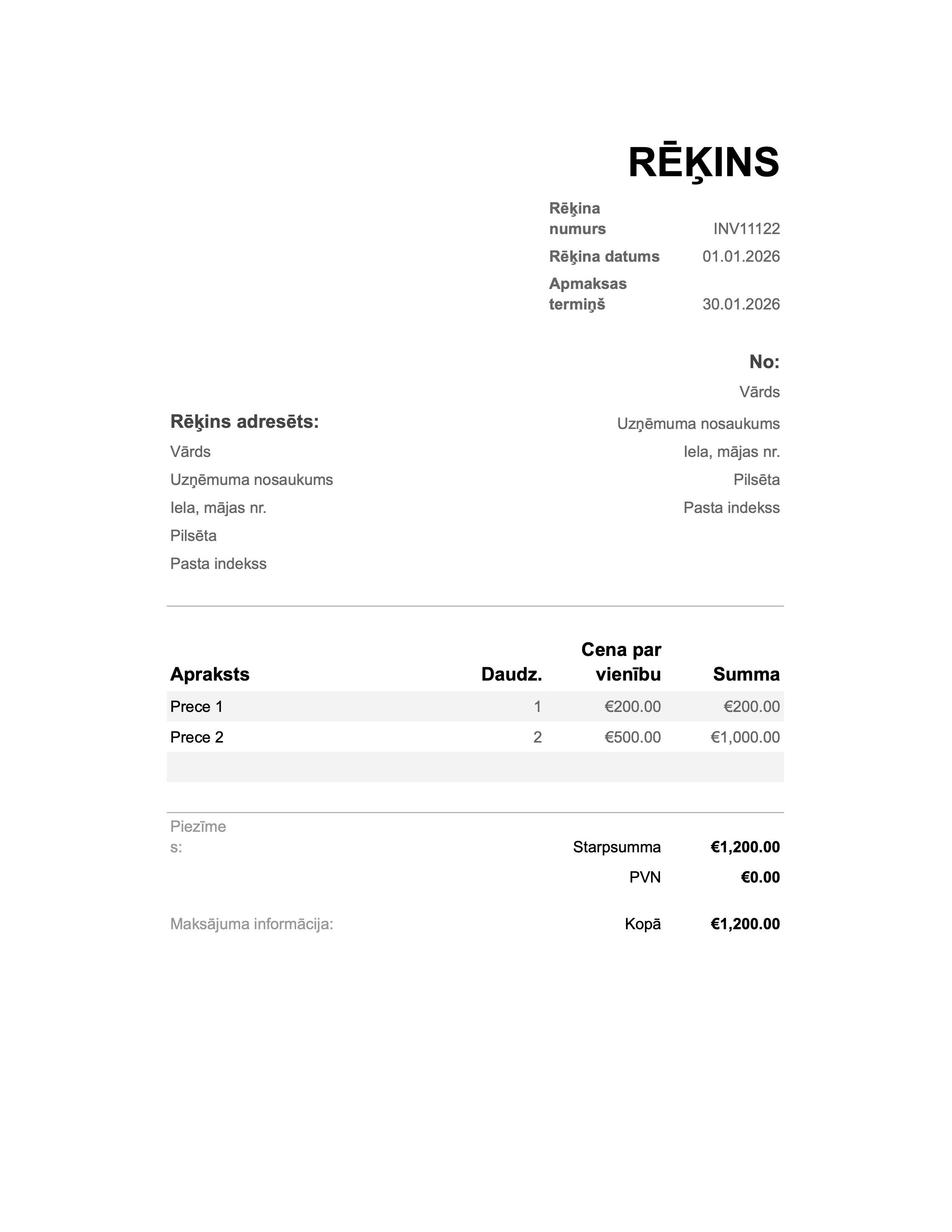 Šī Latvijas rēķina veidne piedāvā tīru un profesionālu izkārtojumu, kas piemērots pašnodarbinātajiem un mazajiem uzņēmumiem.