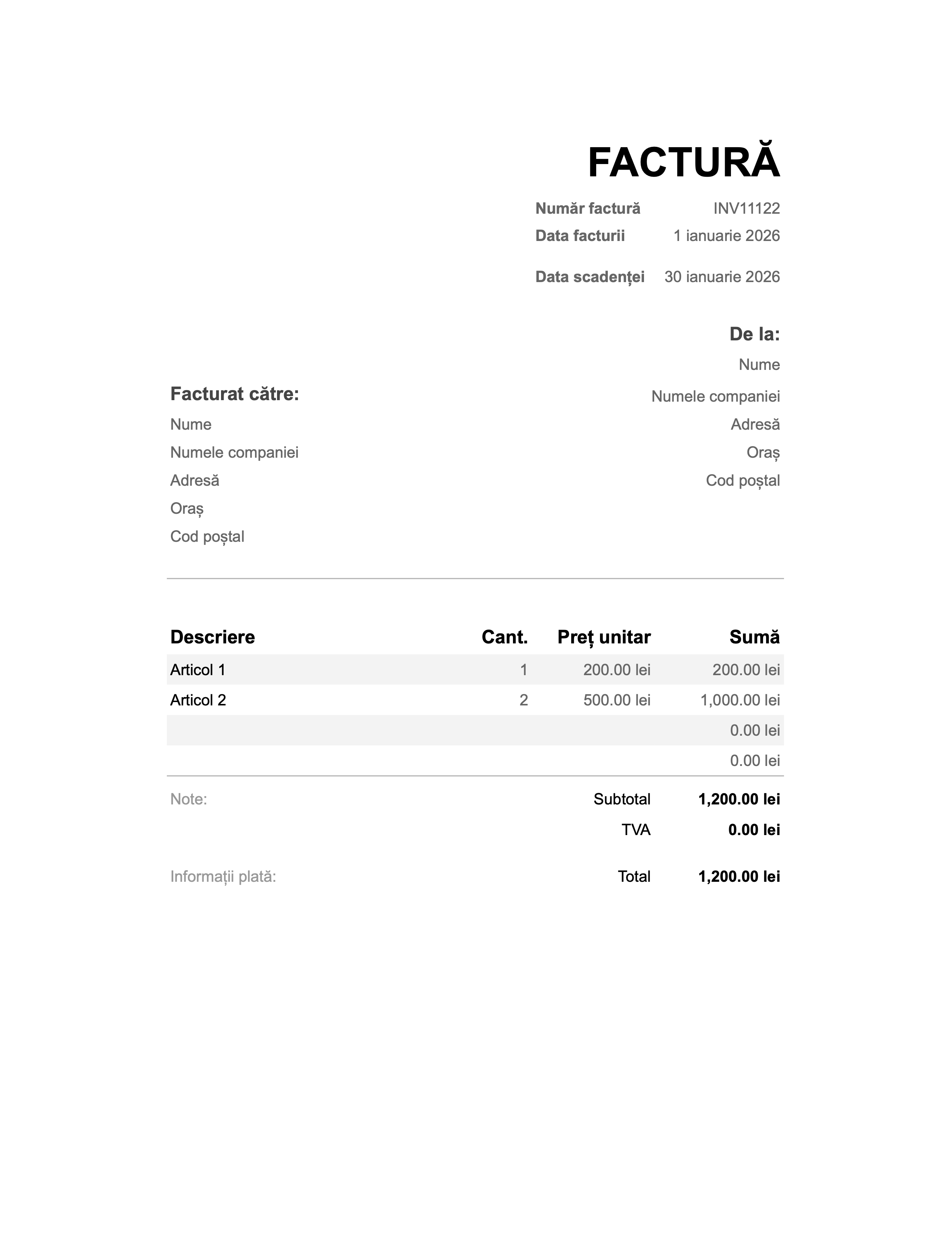 Previzualizează modelul și descarcă factura pentru România în format PDF, Google Sheets, Google Docs, Excel sau Word. Complet editabilă și gata de trimis clienților.